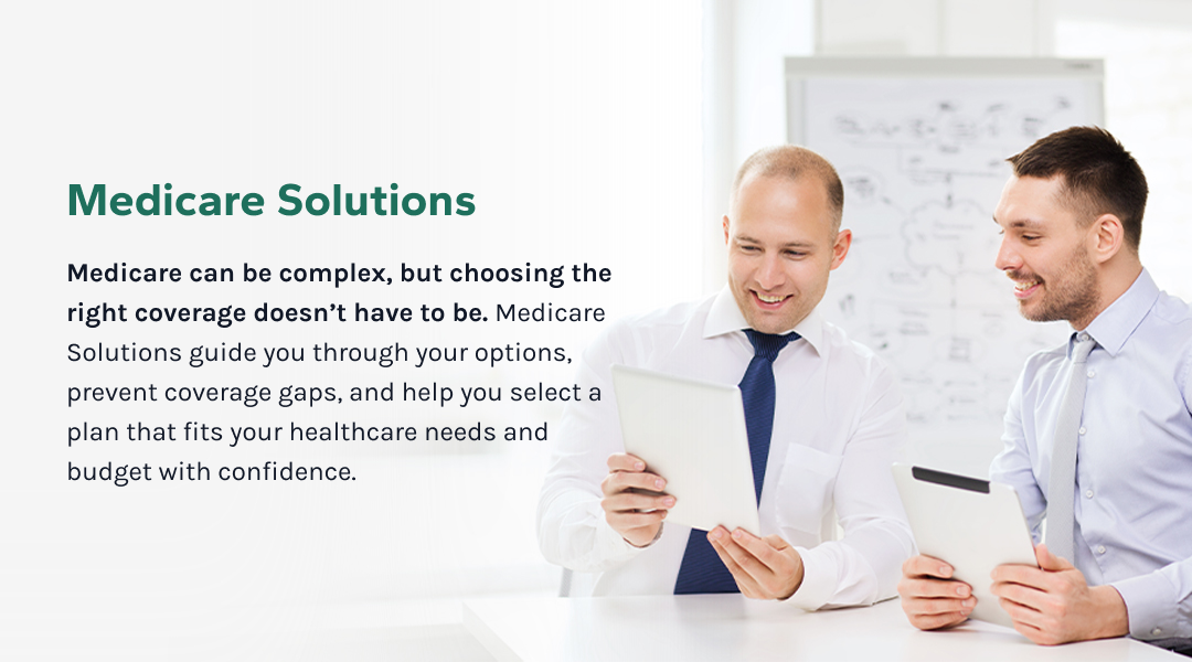 Medicare can be complex, but choosing the right coverage doesn’t have to be. Medicare Solutions guide you through your options, prevent coverage gaps, and help you select a plan that fits your healthcare needs and budget with confidence.